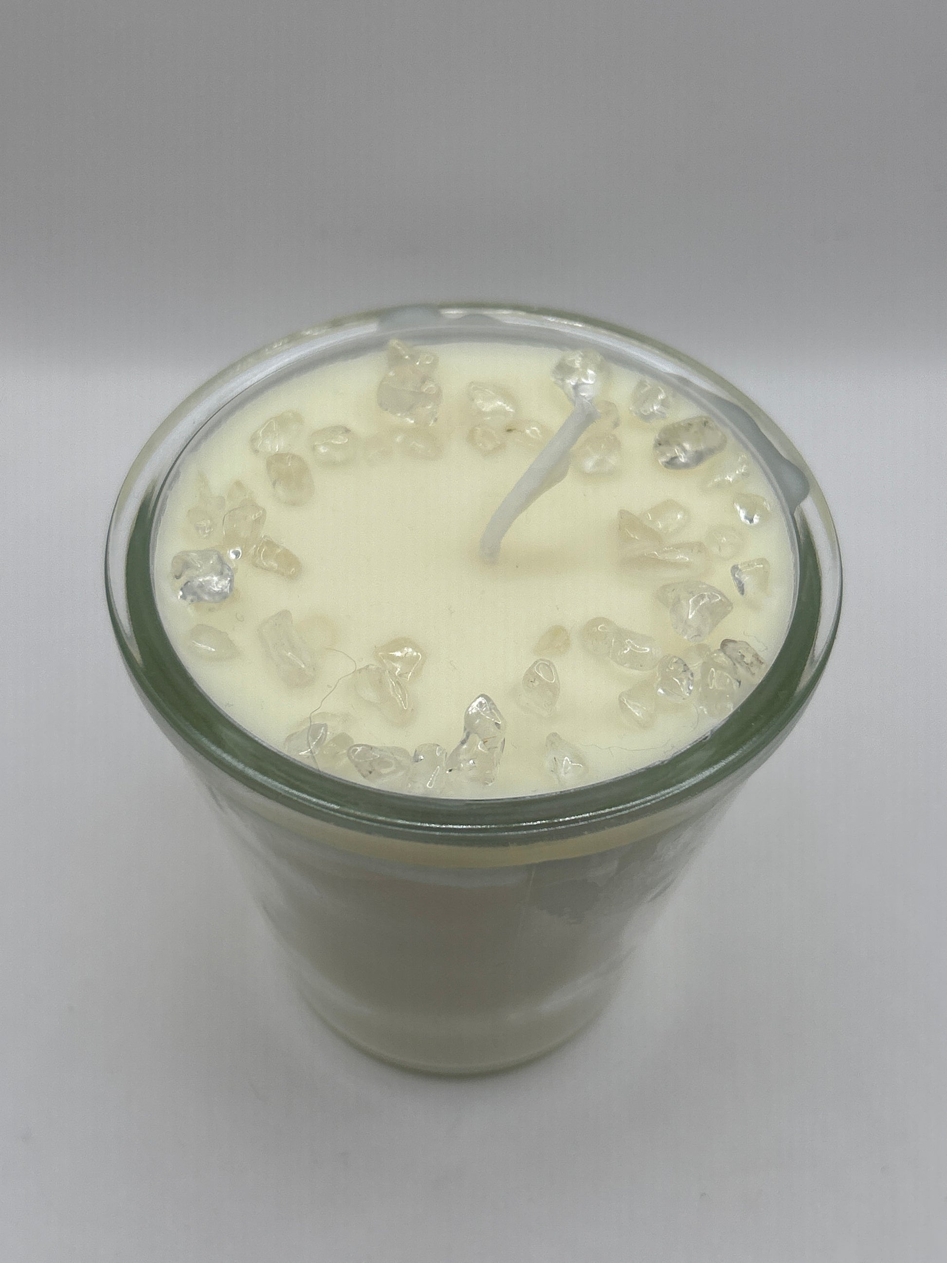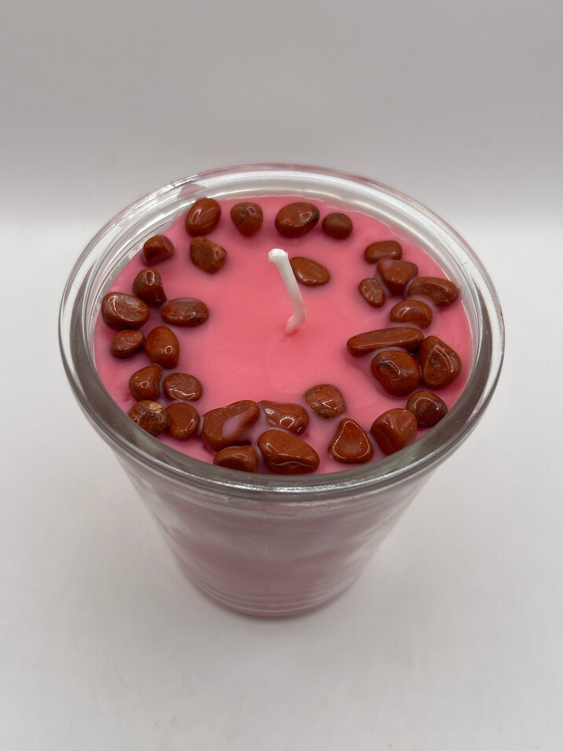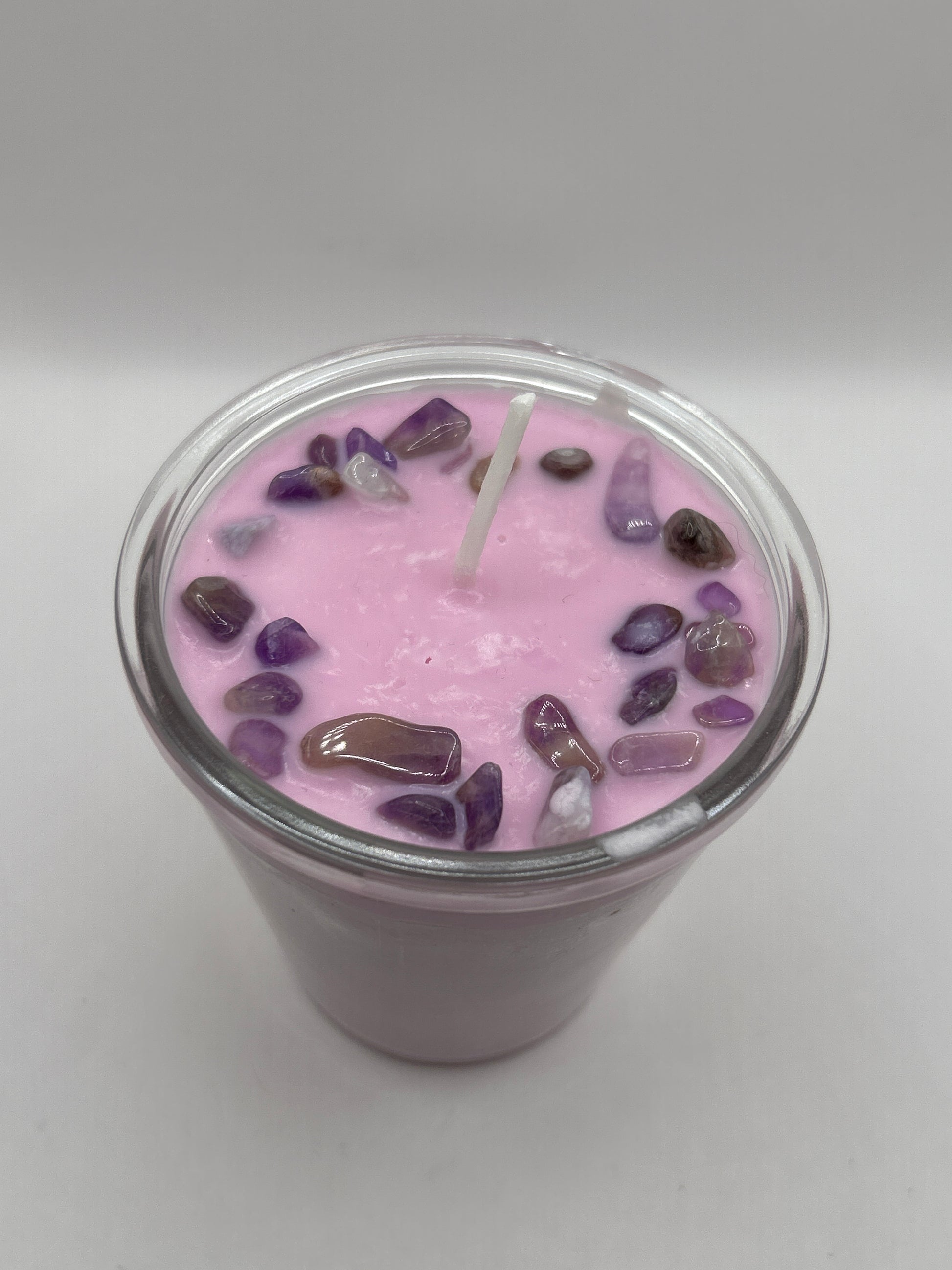 Crystal candles made with a blend of soy wax and beeswax. Essential oils added, along with crystal chips. A piece for building a custom care pouch. Purchasing crystal candles includes a free pouch to hold each crystal’s identification card. Pouch colors may vary. Each candle is unique. Crystal sizes and colors may vary.